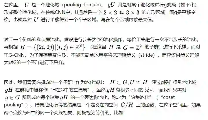 至此,文章定义了G-CNN的核心概念,接下来的部分是从理论上处理非线性和pooling。对于非线性操作,结论是非线性操作与群变换対易,仍然保留等变性质。而G-CNN的池化处理则较为复杂,可分为两部,第一步是不带步长的池化操作,第二步是下采样操作。