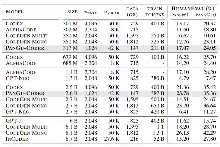 事实证明,这个想法是正确的。模型的一次生成通过率(PASS@1)是代码语言生成模型最重要的能力衡量指标,从这个数据上来看,采取数据集构建策略和分阶段训练设计的 HUAWEI PanGu-Coder 在 3 亿级别上的准确率相比其它公开模型要高很多:3 亿参数的 HUAWEI PanGu-Coder 模型(PASS@1=17.07%)超越了 Codex(PASS@1=16.22%)接近 7 亿参数的模型结果,基本持平了谷歌 10 亿的模型。