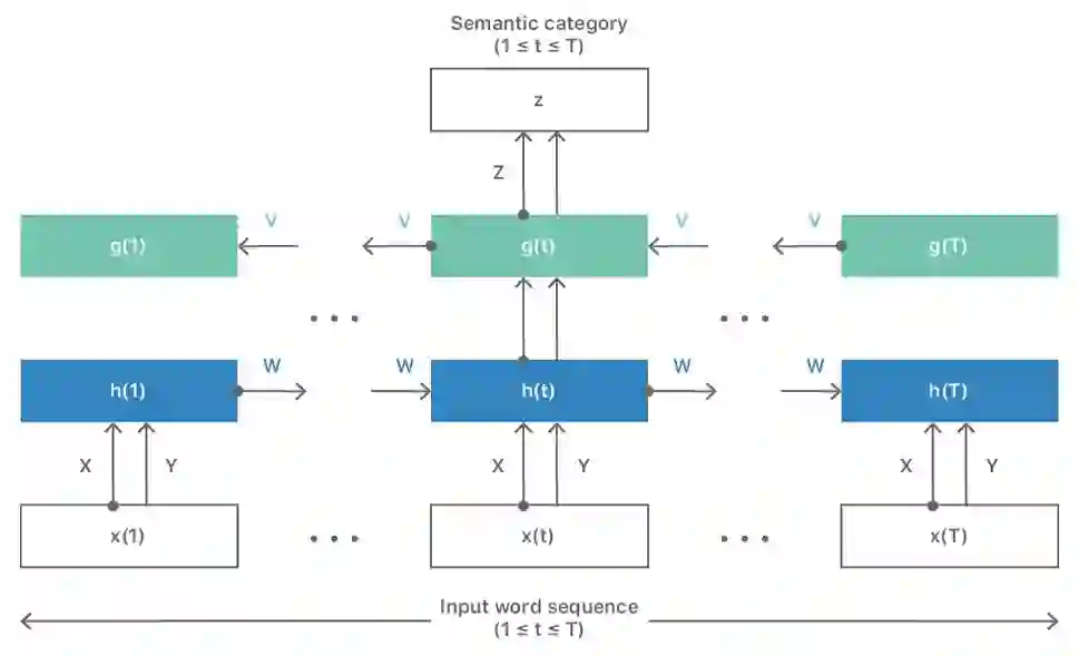 让我们仔细看看网络是如何工作的。假设当前处理的文本块(可能是句子、段落或者时整个文档)包含T个单词x ( t ),1≤t≤T,并且与全局的语义类别z相关。我们将这个文本块作为输入提供给双向RNN架构。