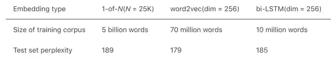 因此,我们决定在用于训练QuickType神经语言模型的(句子)语料库的子集上训练embedding。然后,我们根据我们的标准语言建模测试集上的perplexity来衡量embedding的质量,如表1所示。符号“1-of-N”表示稀疏embedding,而“word 2vec”指的是在大量数据上训练的Word2vec embedding。