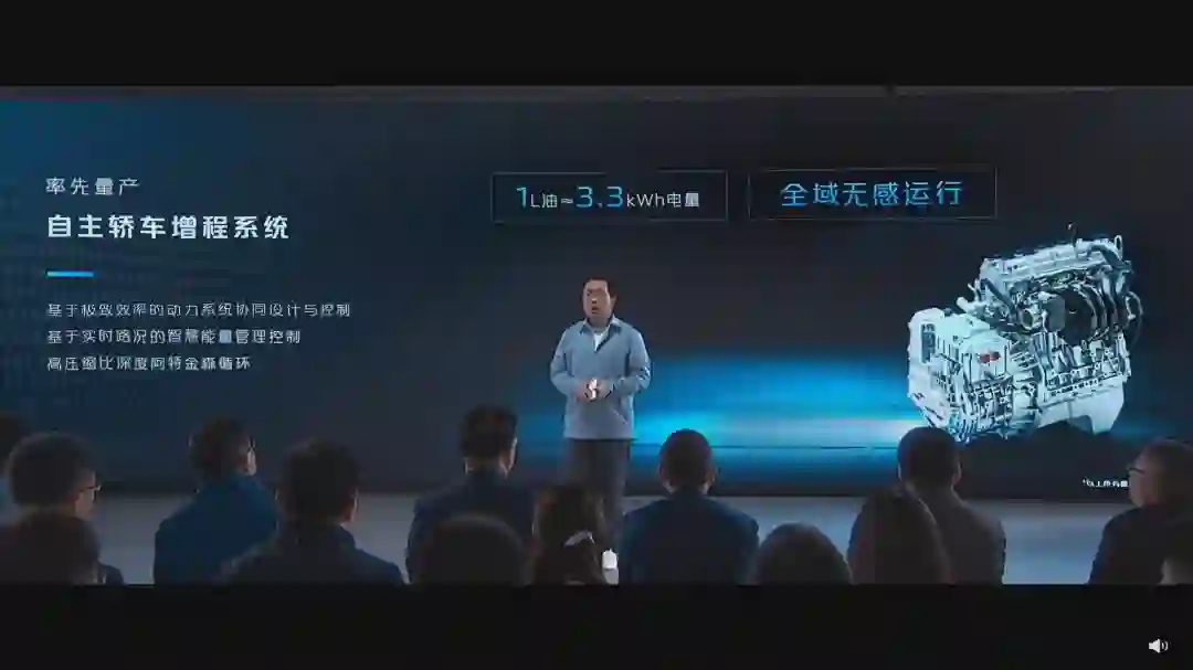 与一台四缸阿特金森内燃机搭配时,1L 汽油可以提供 3.3kWh 电能,加上电池提供的 200km CLTC 续航,综合续航能力 1200km。即便运行在亏电工况,B 状态油耗仍会低于 4.5L/100km。