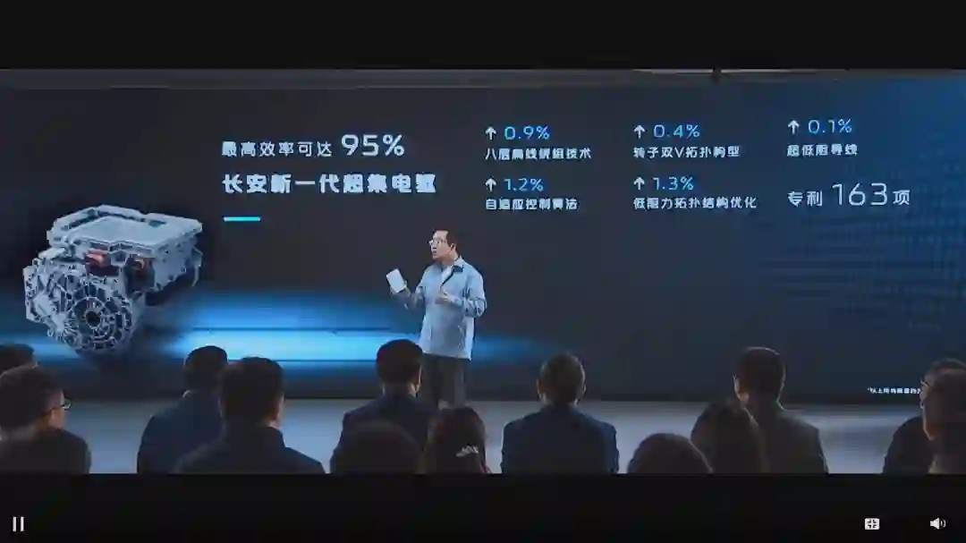 EPA1 平台的所有车型,直接动力来源都是电动机。正如燃油车时代有一个“Well to Wheel”计算油井到车轮全过程碳排放的算法一样,长安也提出了从电网到车轮的效率计算法则,囊括充电效率、电池与电控效率、电机效率与能量回收效率。在这一标准下,高度集成的 EPA1 平台电驱动系统,效率将达到 78% 左右,其中电机效率达到 95%。