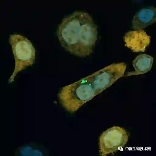 与癌细胞(橘红色)共同生长的细菌(绿色)