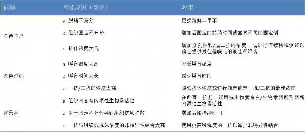 表2.免疫组化(IHC)染色的常见问题(部分)及对策