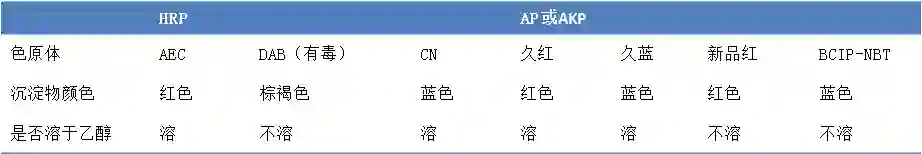显色常用的酶为辣根过氧化物酶(HRP),常用的显色底物为DAB(3,3’-二氨基联苯胺),偶尔用AEC(3-氨基-9-乙基咔唑)。碱性磷酸酶(AP或AKP)也是目前免疫诊断试剂最常用的标记酶之一,稳定性好、灵敏度高。