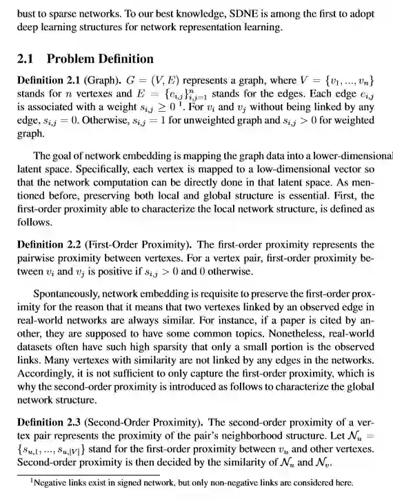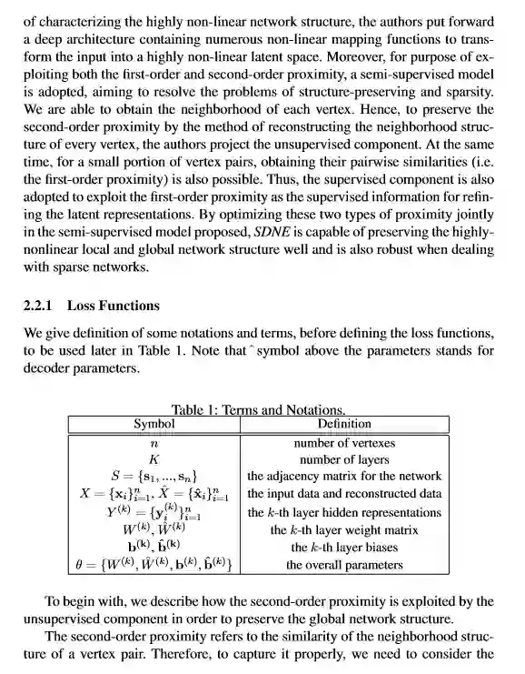 network embedding,是为网络中的节点学习出一个低维表示的方法。目的在于在低维中保持高度非线性的网络结构特征,但现有方法多采用浅层网络不足以挖掘高度非线性,或同时保留局部和全局结构特征。本文提出一种结构化深度网络嵌入方法,叫SDNE该方法用半监督的深度模型来捕捉高度非线性结构,通过结合一阶相似性(监督)和二阶相似性(非监督)来保留局部和全局特征。