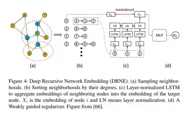 网络嵌入旨在保留嵌入空间中的顶点相似性。现有方法通常通过节点之间的连接或公共邻域来定义相似性,即结构等效性。但是,位于网络不同部分的顶点可能具有相似的角色或位置,即规则的等价关系,在网络嵌入的文献中基本上忽略了这一点。以递归的方式定义规则对等,即两个规则对等的顶点具有也规则对等的网络邻居。因此,文章中提出了一种名为深度递归网络嵌入(DRNE)的新方法来学习具有规则等价关系的网络嵌入。更具体地说,我们提出了一种层归一化LSTM,以递归的方式通过聚合邻居的表示方法来表示每个节点。
