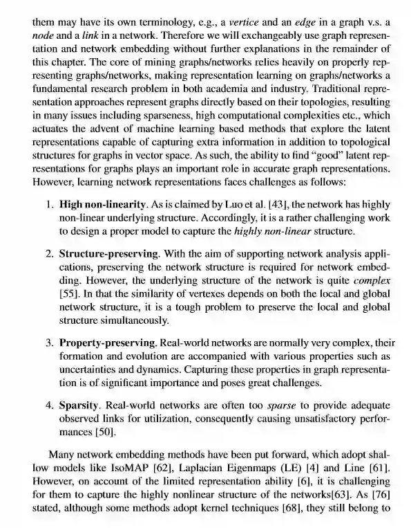 关于图或网络的文献有两个名称:图表示和网络嵌入。我们注意到图和网络都指的是同一种结构,尽管它们每个都有自己的术语,例如,图和网络的顶点和边。挖掘图/网络的核心依赖于正确表示的图/网络,这使得图/网络上的表示学习成为学术界和工业界的基本研究问题。传统表示法直接基于拓扑图来表示图,通常会导致许多问题,包括稀疏性,高计算复杂性等,从而激发了基于机器学习的方法的出现,这种方法探索了除矢量空间中的拓扑结构外还能够捕获额外信息的潜在表示。因此,对于图来说,“良好”的潜在表示可以更加精确的表示图形。但是,学习网络表示面临以下挑战:高度非线性,结构保持,属性保持,稀疏性。