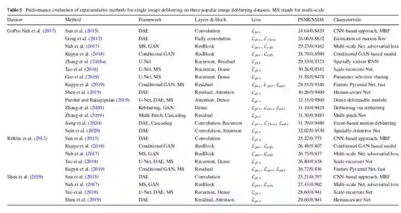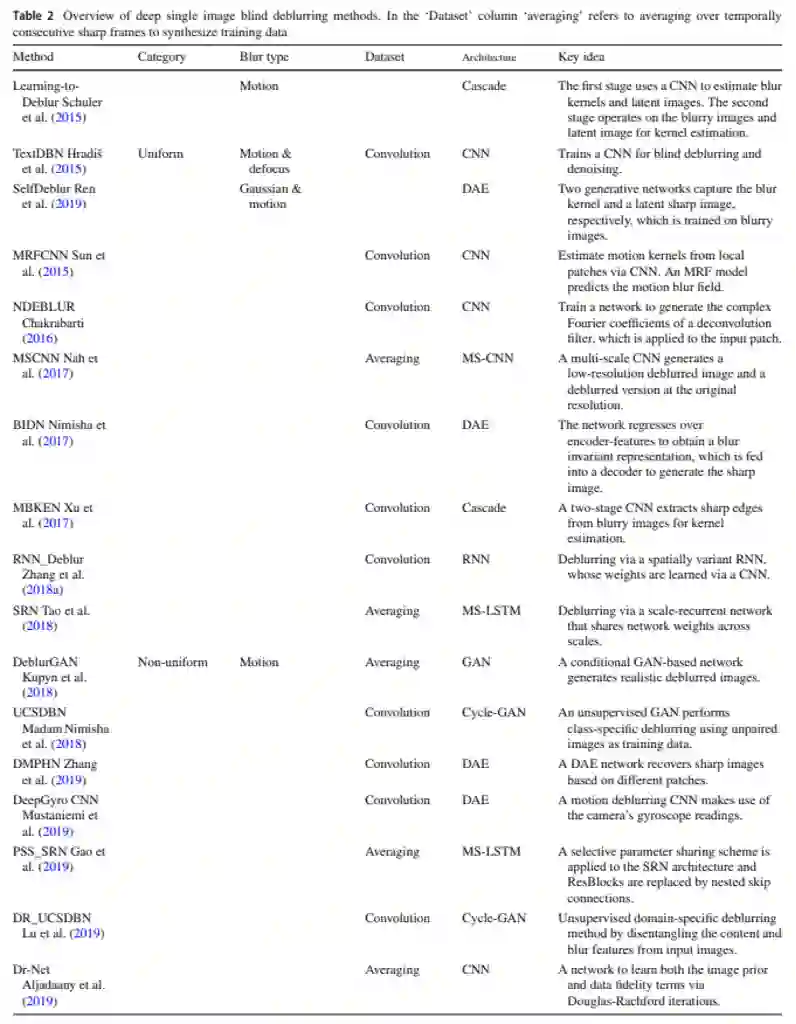 当模糊图的模糊核未知时,图像去模糊任务被称为盲图像去模糊。早期的盲图像去模糊方法侧重于去除均匀的模糊核。然而,真实世界的模糊图像,其不同区域通常是由不同的模糊核生成,因此其模糊核是非均匀的。为了解决盲图像的去模糊任务,多种基于深度学习的图像去模糊算法被提出。本文在下面表格中总结了现有的基于深度学习的盲图像去模糊方法,这些方法通常采用各种不同的网络框架,包括多尺度网络、对抗神经网络、级联网络、再模糊网络等等。