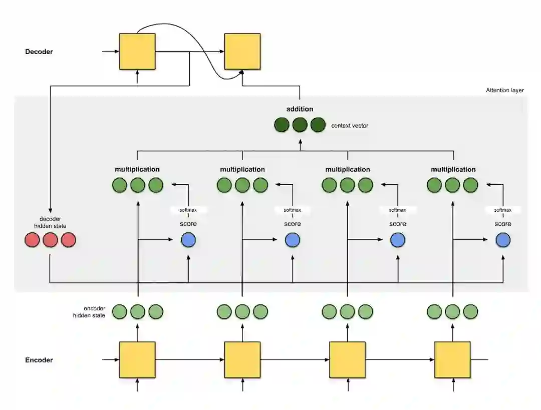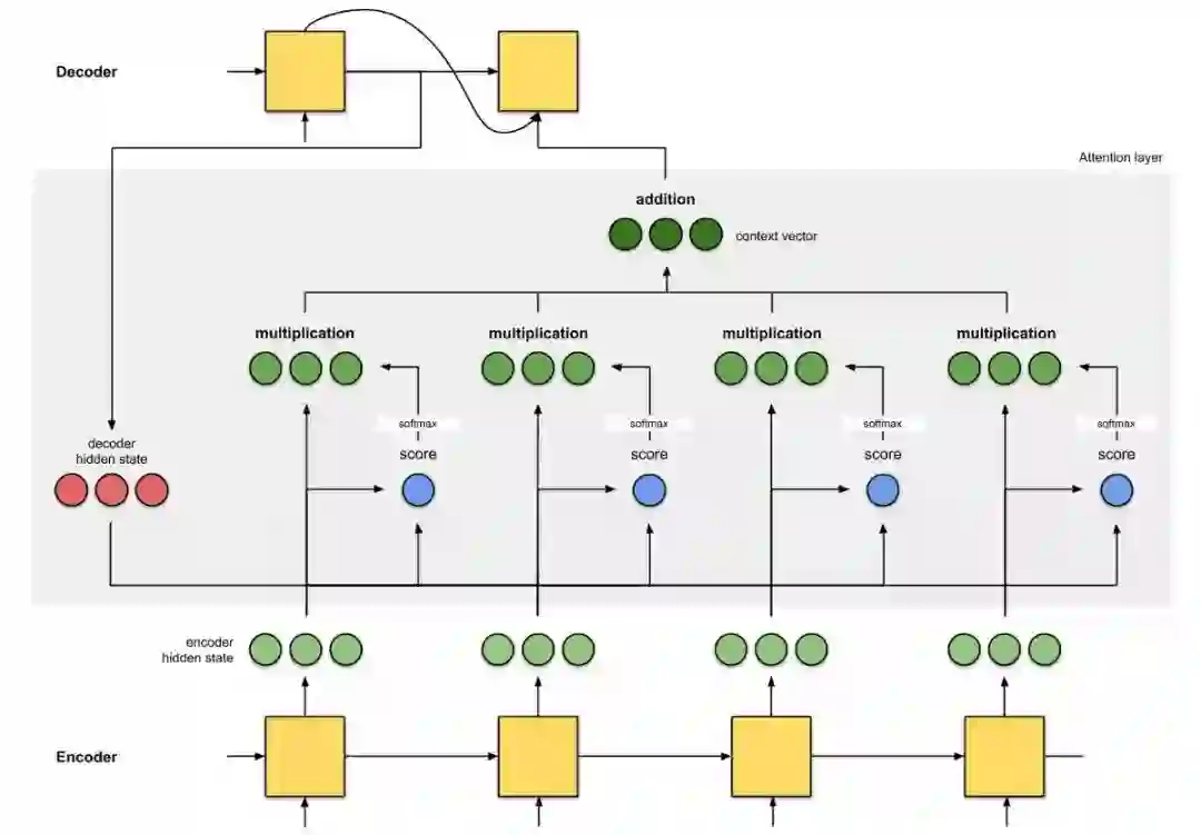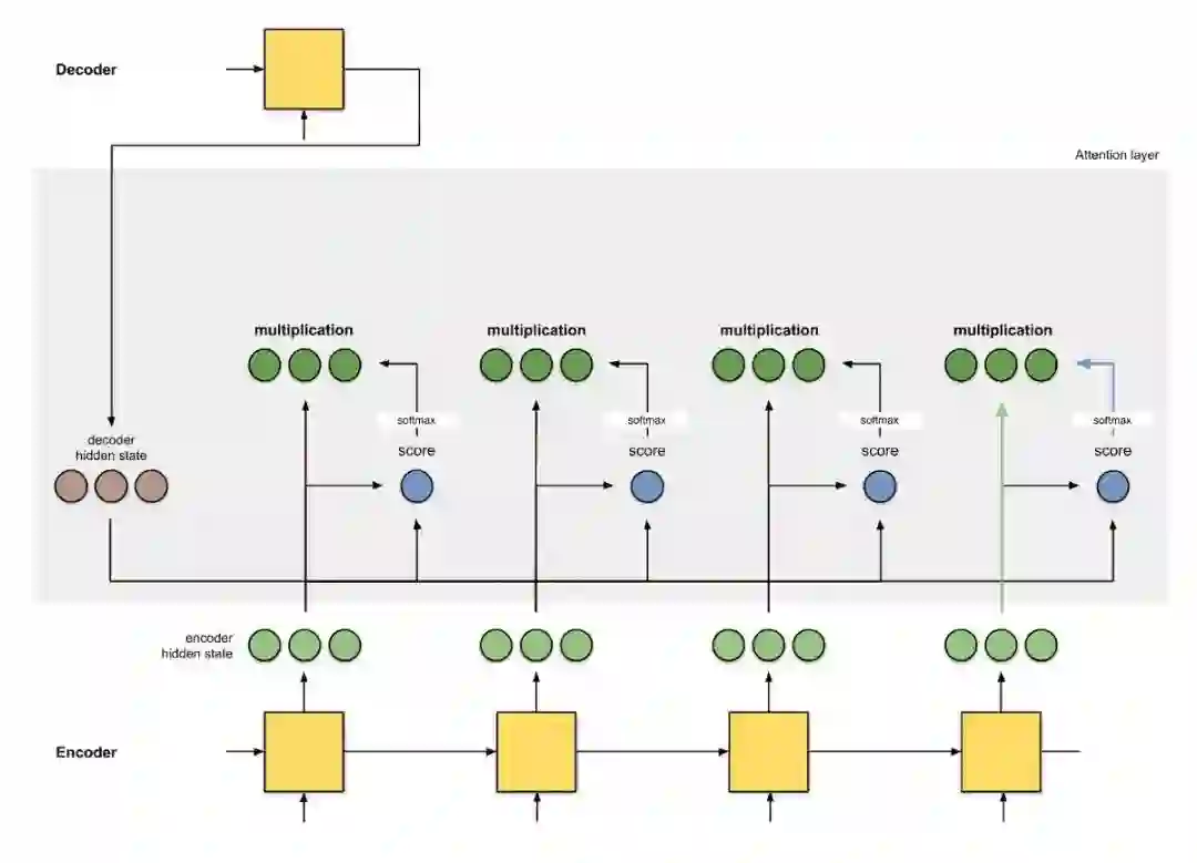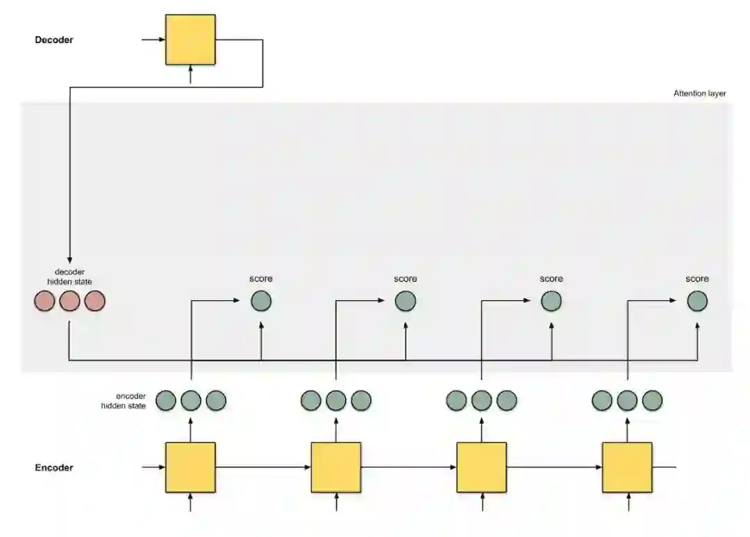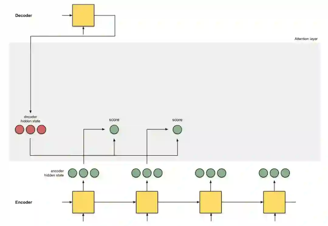 首先准备第一个解码器隐藏状态(红色)和所有可用的编码器隐藏状态(绿色)。示例中有 4 个编码器隐藏状态和当前解码器隐藏状态。