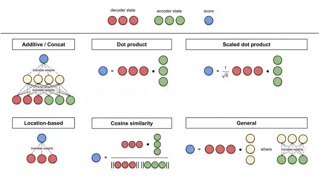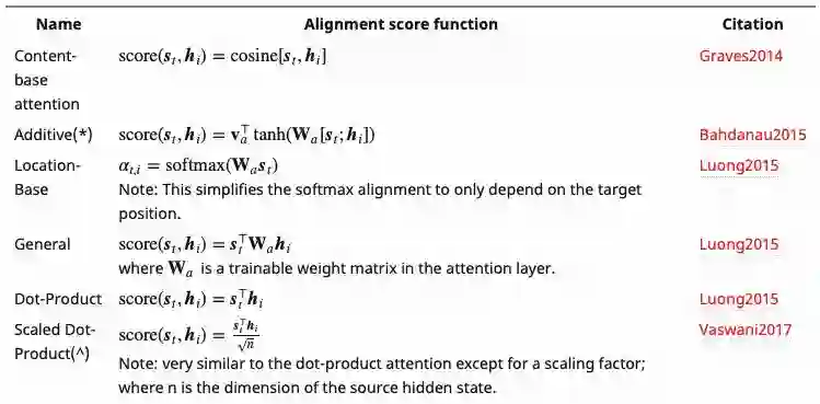 以下是 Lilian Weng 编写的一些评分函数。本文提到了 addictive/ concat 和 dot product。涉及点积运算(点积、余弦相似度等)的评分函数的思路是度量两个向量间的相似度。对于前馈神经网络评分函数,思路是让模型学习 alignment 权重和译文。