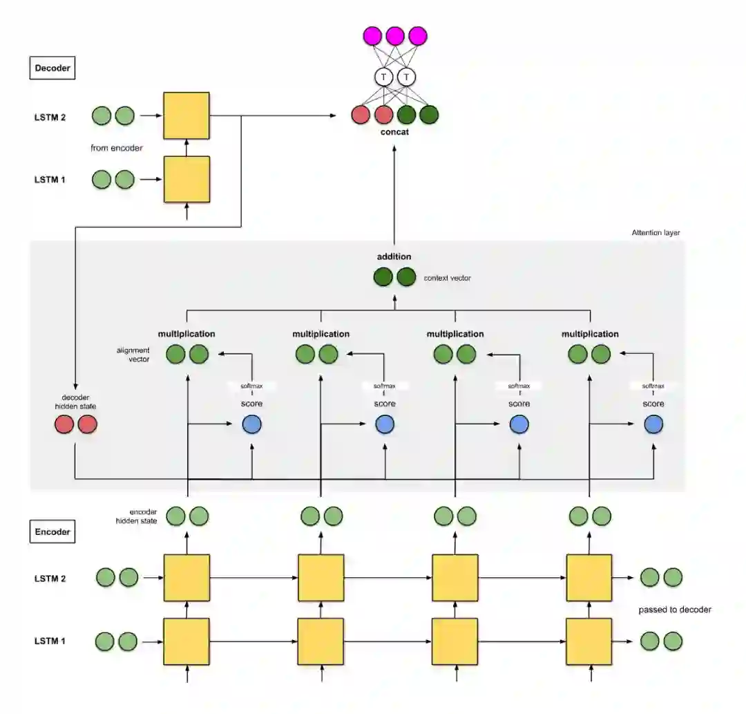 同样,和 [1] 一样,下一个解码器步的输入是前一个解码器时间步(粉红色)的输出和当前时间步的上下文向量(深绿色)之间的级联。