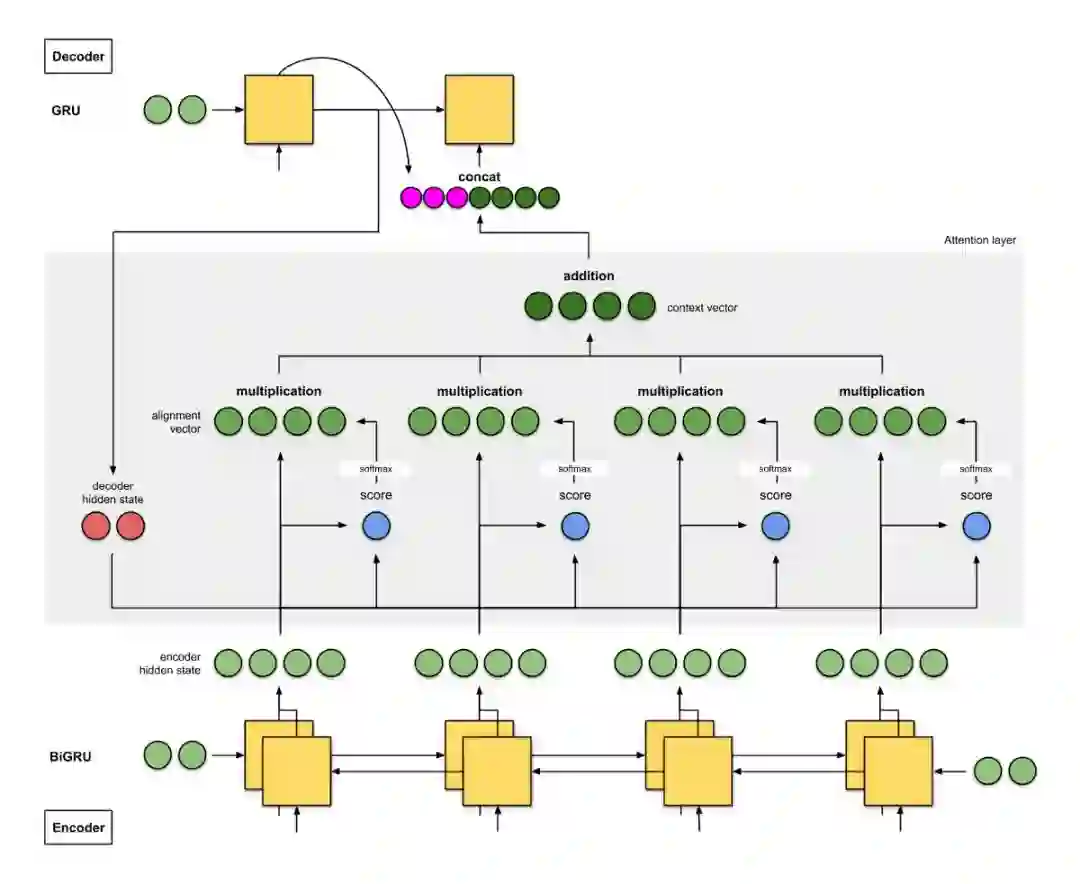 编码器是双向(前向+后向)门控循环单元(BiGRU)。解码器是 GRU,其初始隐藏状态是从反向编码器 GRU 的最后隐藏状态修正而来的向量(未在下图中示出)。