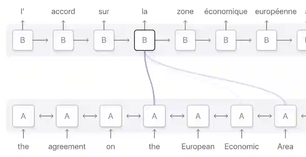 翻译器 A 在读取德语文本时记录关键词。翻译器 B(担任更高级角色,因为它能从后往前进行读取)从后往前读取相同的德语文本,同时记下关键词。两个翻译器会定时「交流」它们读取的每一个单词。在读完整篇德语文本后,翻译器 B 负责根据「交流结果」和它们共同选择的综合关键词,将德语句子逐词译成英文。