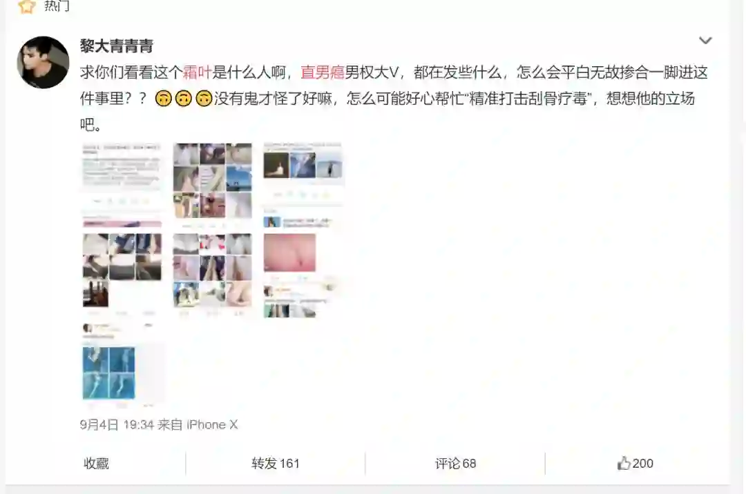 具体到本次事件中,大V“霜叶”在发声过程中被网友们扒出众多黑历史,质疑其人品的背后是对其“话语权”的质疑,例如“你自己都污迹斑斑凭什么跑出来伸张正义”的声音也在此事中各成一派。