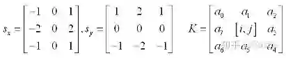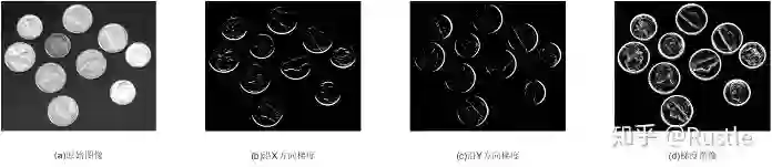 图中(a)为原始的灰度图像,(b)和(c)为使用图3-3中Sobel算子的 两种形式分别对原始图像进行的滤波结果,即表示为分别沿X、Y轴的梯度图,最后将两个图融合在一起则得到了我们所需的梯度图像(d),在给大家一张图来帮助理解Sobel算法