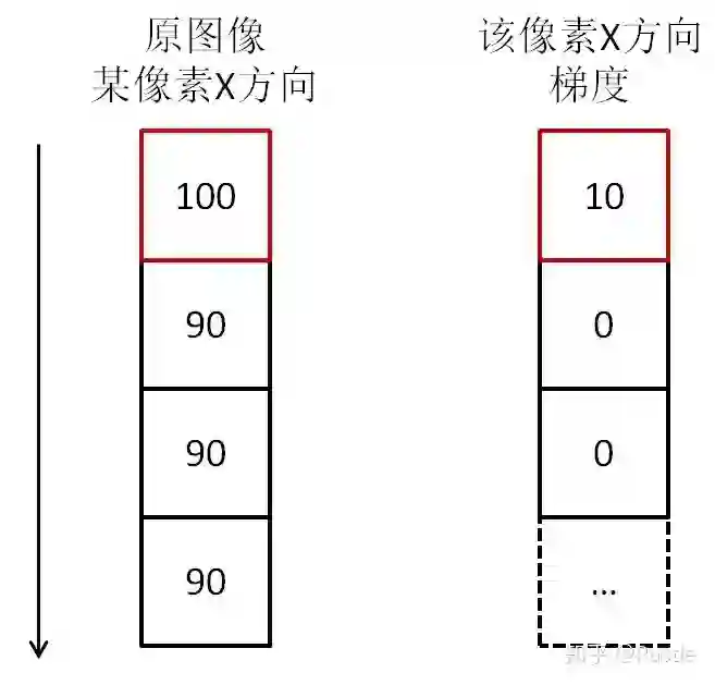 图中我们可以看到,100与90之间相差的灰度值为10,即当前像素点在X轴方向上的梯度为10,而其它点均为90,则求导后发现梯度全为0,因此我们可以发现在数字图像处理,因其像素性质的特殊性,微积分在图像处理表现的形式为计算当前像素点沿偏微分方向的差值,所以实际的应用是不需要用到求导的,只需进行简单的加减运算