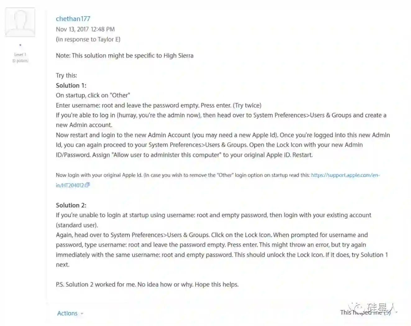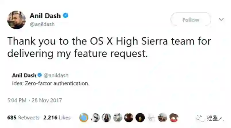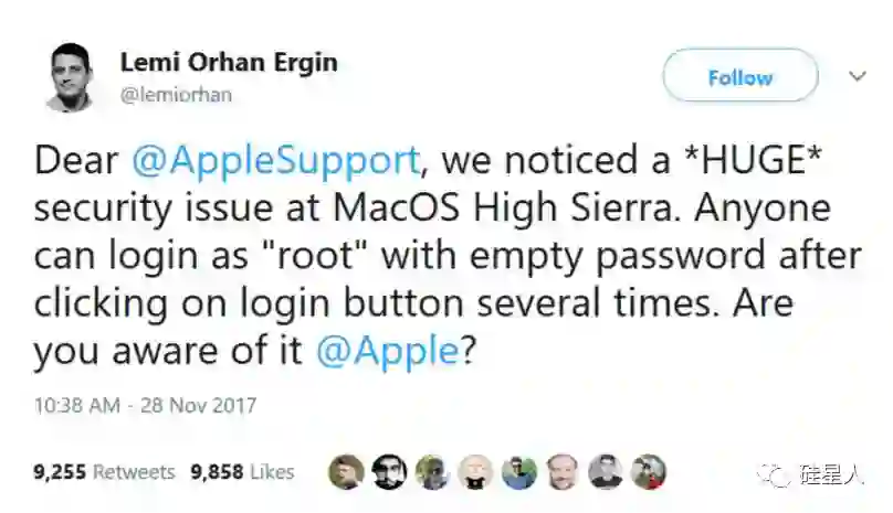 根据 Twitter 上的用户以及一些信息安全博客的说法,目前这个漏洞仅限于 macOS High Sierra。硅星人又在另一台安装了 macOS Sierra 的 12' MacBook 上测试,没能复现。