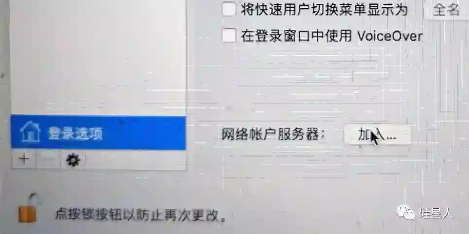 还是系统偏好设置→用户和群组,点击左下角的登陆选项,再点击网络账户服务器旁边的「加入」按钮: