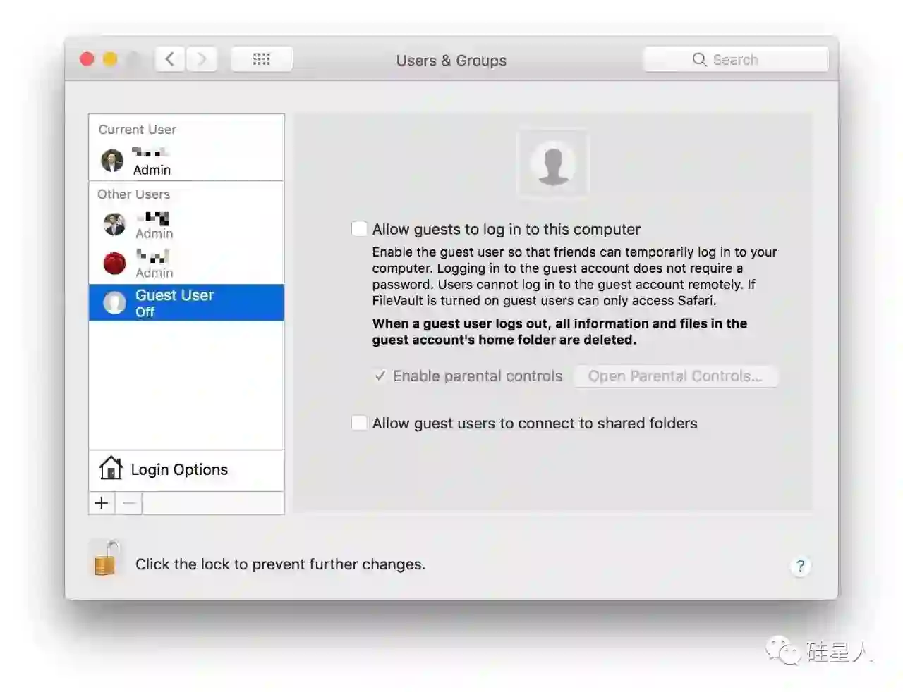 首先,你需要关闭访客登陆。进入系统偏好设置→用户和群组→点击客人用户(访客),反选所有的选项。如果你已经是管理员的话,需要点击左下角的锁按钮,输入自己的用户名密码再进行更改,下同。
