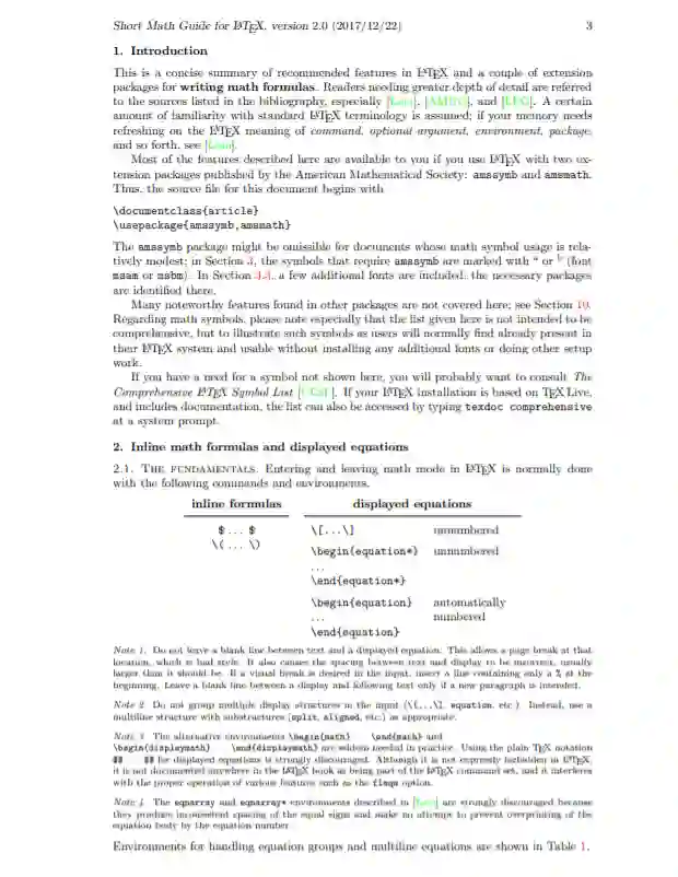 本文简要介绍了LATEX中推荐的特性,以及几个用于编写数学公式的扩展包。需要更深入的细节的读者可参考参考书目中列出的来源,特别是[Lam], [AMUG]和[LFG]。假设您一定程度上熟悉标准LATEX术语;如果您的内存需要刷新命令的LATEX含义,可选参数,环境,包,等等,参见[Lam]。如果您将LATEX与美国数学学会发布的两个扩展包(amssymb和amsmath)一起使用,那么这里描述的大多数特性都是可用的。因此,这个文档的源文件以\documentclass{article} \usepackage{amssymb,amsmath}开头。在第3节中,需要amssymb的符号被标记为a或b(字体为msam或msbm)。在第3.3节中,包含了一些额外的字体;必要的包在那里被标识出来。在其他包中发现的许多值得注意的特性在这里没有涉及;参见10。关于数学符号,请特别注意,这里给出的列表并不是全面的,而是为了说明用户通常会在LATEX系统中发现的一些符号,这些符号无需安装任何额外的字体或做其他设置工作就可以使用。如果你需要一个没有在这里显示的符号,你可能会想要咨询综合LATEX符号列表[CLSL]。如果您的LATEX安装是基于TEX Live的,并且包含文档,那么也可以通过在系统提示符下输入texdoc comprehensive来访问该列表。