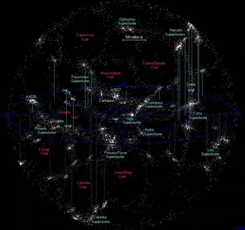地球附近的大尺度宇宙结构。我们对宇宙的认识还在深入过程中。目前看,宇宙似乎存在宏观结构,星系或是星系团依附在类似蛛网状的结构之上,分布其中(来源:NASA)