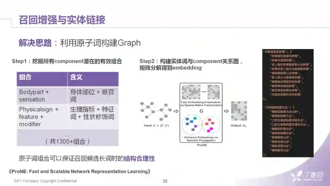 同时,不同的组成成分在位置上存在的是有限的组合,通过对已有的一些实体词挖掘,最后我们可以固定1300多种组合。后续我们再将这些原子词和组成成分相互连接,构成一个graph。然后固定的组成成分的组合类型,就为图中的有向边提供了数据来源。我们拿这个graph可以使用LINE、node2vec之类的方式train一个embedding。我们采用的是清华大学19年在IJCAI上发表的矩阵分解的方法。可以看到我们train完graph embedding后,相似度聚合的一些结果。可以发现以这种方式结构化一个疾病词可以保证疾病词在结构上的稳定。也就是说,原始的排列组合想要表述的是某种肿瘤,我们需要保留这个肿瘤作为base词的结构。