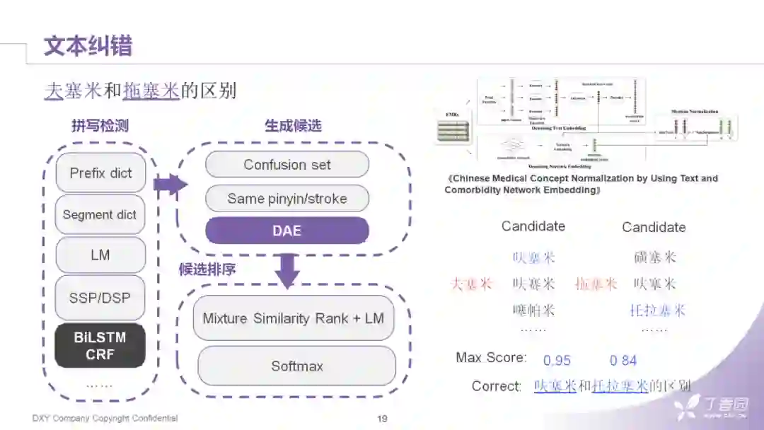 生成候选词。常见的做法就是利用同音、同型字典把出错的字替换掉,然后生成一个候选集合。这里值得一提的是:如果我们所在的业务场景是比较窄的情况下,比如只需要搜索药品或者搜索疾病时,我们借鉴18年发表在IEEE上一篇关于医疗概念归一化的文章,它的主要思路是对原文本中一些字做增减或者替换,然后构建一个confusion set ( 混淆字集合 ),把词跟字的连接构成一个graph,然后获得graph上的embedding之后一起放进端到端的auto encoder,即DAE,把DAE训练到收敛之后会使用一个向量集的检索生成候选集。在实践中,这个方案效果更优一些。