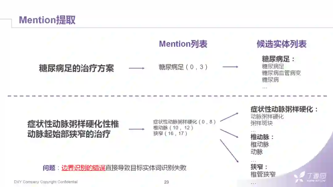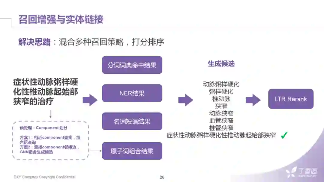 我们现在还是以基础版的组件继续往下走,以上的几个步骤为后续做实体链接框定了词的边界。候选词一般我们用常见的搜索引擎,比如solr,给它做一个倒排索引,然后我们再拿mention去找目标实体词。如果是下面的情况,医学名词的span非常长,mention提取时,其实就失败了。这种失败也会直接导致实体链接的失败,所以我们的思路就是在召回阶段再做一层补充的策略。