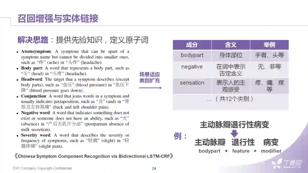 前面提到医学中的长词通常会由多个组成成分进行组合。这种组成成分其实可以根据一些先验知识把它先规范好。相似的思路,我们在华东理工大学的一篇工作中也看到了。文章作者是根据SNOMEDCT中"临床发现"的分类层次体系把症状词拆分成了不同的组成。我们也根据自身的场景完善了12个类别的成分原子词,比如例子中的"主动脉瓣退行性病变",然后可以分成:身体部位+特征词+性质修饰词。