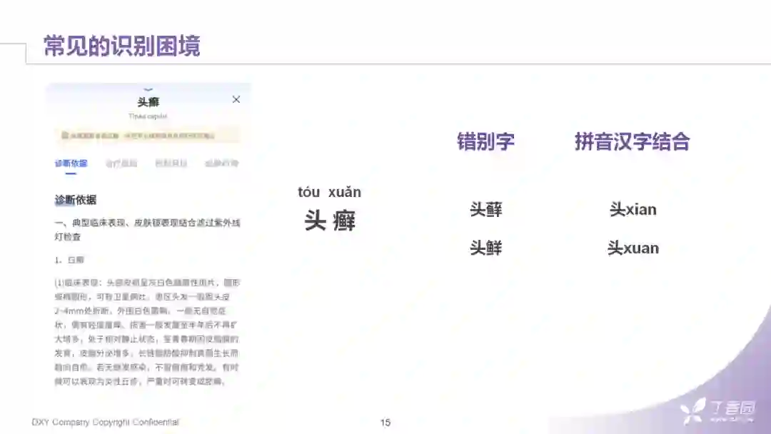 首先是错别字的问题。错别字问题在各个领域的搜索中都是非常常见的问题。常见的错别字原因,可能来自于拼音使用的错误。比如"头癣"这个词,大多数人会念成"头藓","藓"字就会常常出没在相关的搜索query里。另外,还会出现和拼音相关的识别问题,比如"头xian"和"头xuan",这种汉字和拼音混搭的情况。