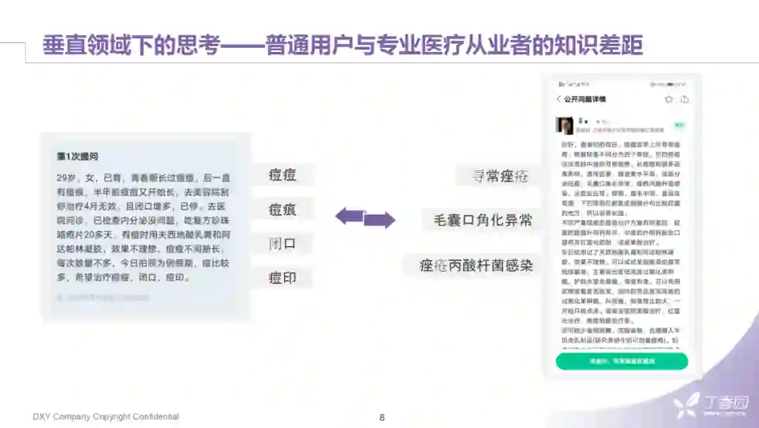 除了医疗话题在主题上不好做结构化,在处理面向大众的文本时,认知层面的差异也是个棘手的问题。医学知识、医学词汇都具有高度的专业性。比如用户在表述中,一个非医学背景的人会用"痘痘"、"青春痘"、"闭口"、"痘印"这样的词去表述自己的症状。在医生看来这些症状会是"寻常痤疮"、"毛囊口角化异常"等专业词汇。当我们想要帮助大众检索到想要的信息时,就要想办法跨过这些表述不一样的情况,因此我们在三个方面做了一些努力: