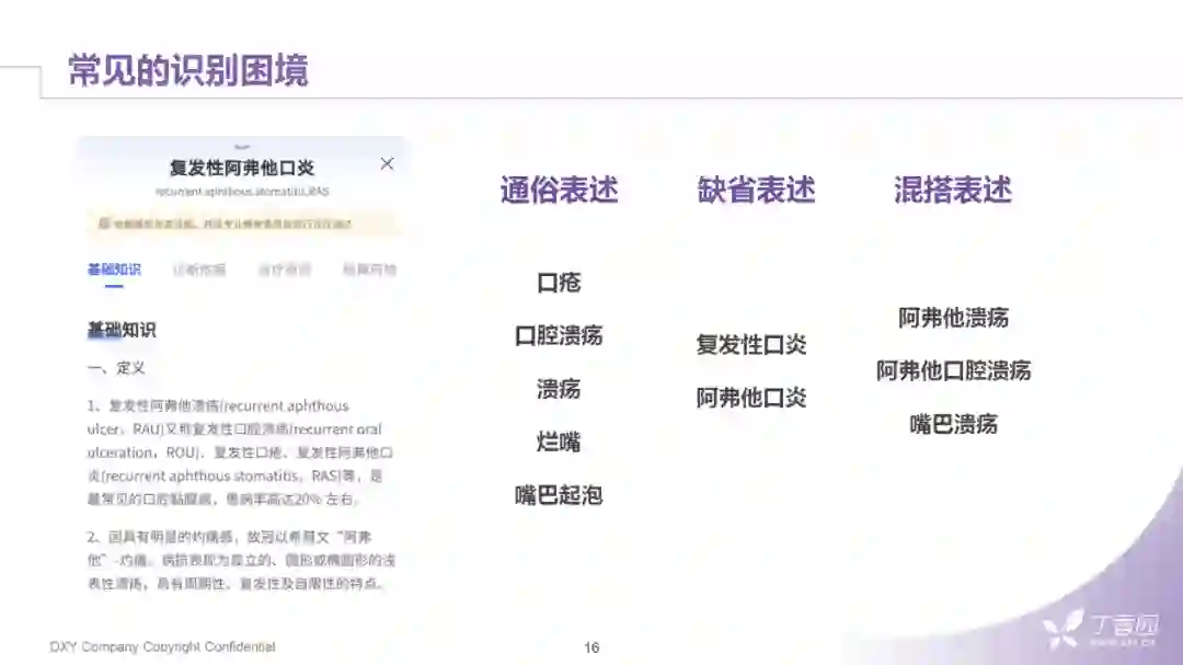 非医学科班的同学看到"复发性阿弗他口炎"这个词肯定是一脸懵。其实这个词和感冒一样是非常常见的问题,就是我们平常说的"口腔溃疡"。但对于大众来说,会有更多通俗的表述,如"口疮"、"口腔溃疡"、"口腔溃烂"、"嘴巴起泡"等等。如果是医学背景的用户,他大概率会知道这个专业名词,但是会出现其他的一些错误,比如表述上会缺其中的一个组成部分或者缺一到两个字,如"阿弗他口炎"或者"复发性口炎"。还有种情况就是把通俗表述和缺省表述混搭的表述方式,如"阿弗他溃疡"、"阿弗他口腔溃疡"。