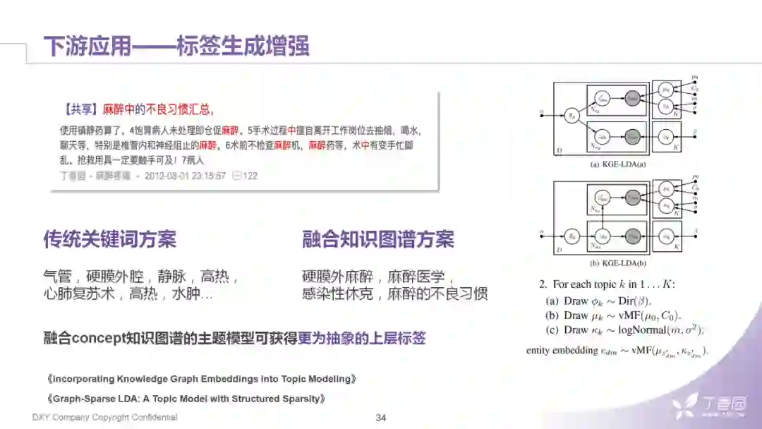 我们在文本结构化上也可以利用concept做一些提升,文本结构化对于提升搜索效果起到了非常重要的作用。有了concept之后可以帮助我们从抽象的层面完成对文本打标签。业界中比较好的方案,是先用一个TransE之类的知识表示模型,把知识图谱train出Embedding,然后将这些Embedding融合进LDA的模型中。在模型中,会用vMF分布代替原来的高斯分布来处理实体词的部分。这样我们就会对一篇,如"麻醉不良习惯"的讨论帖子抽出"麻醉医学"和"麻醉的不良习惯"这样的关键词。
