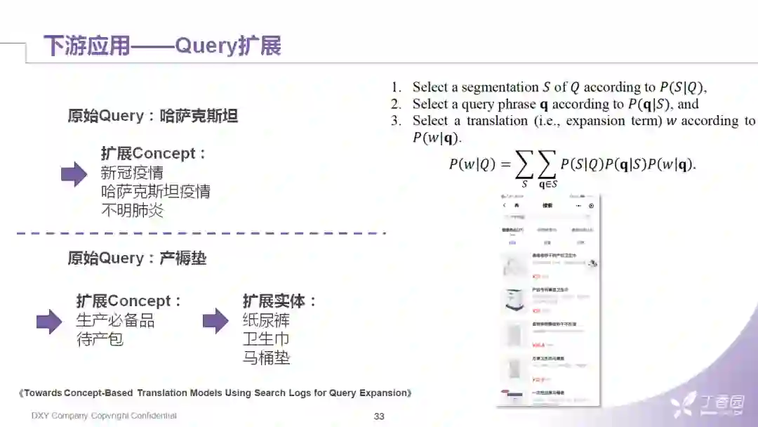 早期比较朴素的方案是用EM算法找两类词的对齐关系,现在新的方案都是上神经网络train一个生成模型。在我们有了concept层之后,用一些很简单的策略就能有不错的效果,比如我们会直接使用相关性的方式,也就是刚才提到的第一类方法去建模,就可以把原始query向concept层上扩展。比如"哈萨克斯坦",就可以扩展出"新冠疫情"或"不明肺炎";同样,在电商场景下,我们可以利用扩展的concept和其他的实体关系做一个二级扩展,比如"产褥垫"可以扩展出"待产包",然后再从待产包扩展出"卫生巾"、"纸尿裤"。这样的应用其实也带了一点推荐的意思。