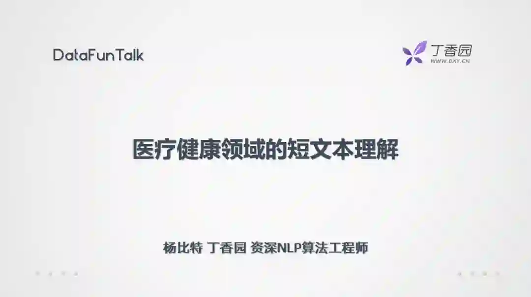 杨比特,硕士毕业于军事医学科学院,负责丁香园大数据NLP组,目前专注于医疗健康领域下的自然语言处理、知识图谱构建与应用、搜索与推荐技术。