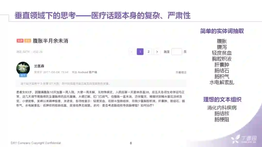 对于医学知识本身的复杂性,在处理面向医生的文本数据时,是不得不面对的问题。例如,这是在丁香园中的一则病例讨论。这位医生详细描述了在工作中遇到的一则病例,其中包括了非常多的专业术语。我们用了一个简单的实体抽取方法进行抽取可以获得"腹胀"、"腹泻"这样的疾病症状词。但是全文的信息量不仅在于这些实体词上,也有相当一部分是存在于这些词之间,复杂的逻辑关系。在常见的搜索方法中,我们会用词的倒排索引来完成文章检索这件事,但是倒排索引在执行过程中很难保证主题不会发生偏移。在理想情况下,我们更希望抽象出更具概括性的标签来结构化这些数据。