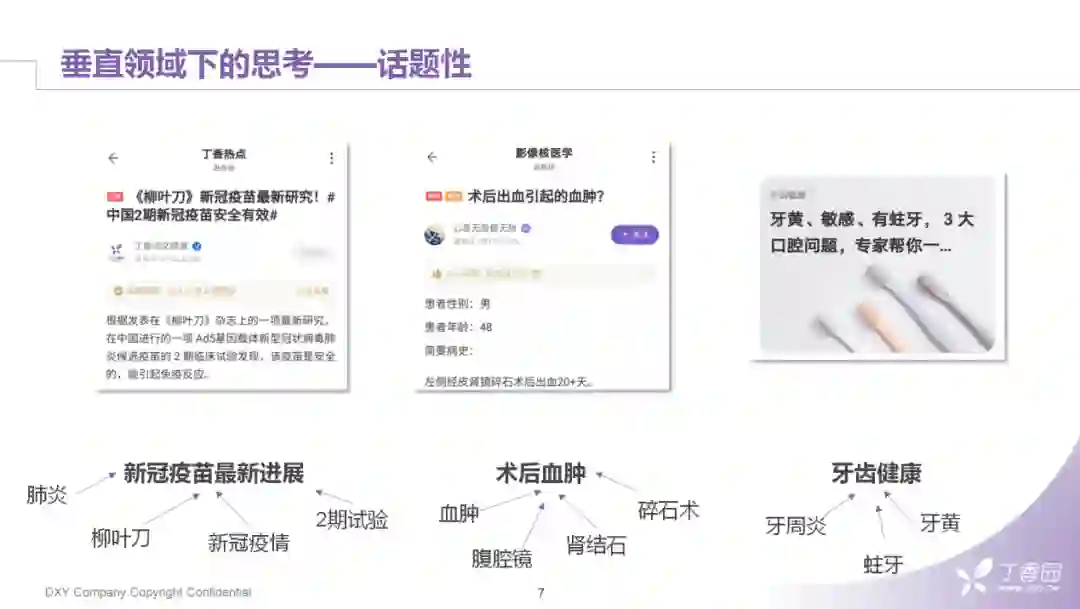 最后一张图是面向大众的科普,这块比较容易理解。医疗话题的底层是由许多复杂逻辑与细节组成的。当用户提问"坐月子能不能洗澡"时,如果只回答"能"或者"不能"显然是不够的,而是需要组成一个话题来讨论或者用更加友好的方式来回答。