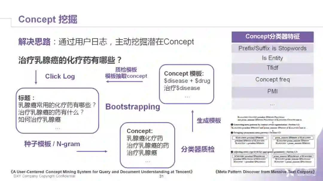 首先,我们收集了一批用户的搜索点击日志,然后在启动阶段定义一些种子模板,再利用模板和N-gram的策略产生一批短语,这些短语不会直接拿来用,因为其中会有一些边界问题或者模板带来的语义漂移问题。所以对生成的这些原始concept,我们会做一个分类器,作为在质量上的约束,留下质量比较高的concept。此外,再把生成的concept重新放到Query或者句子中,让它产生新的模板。这里模板的产生,我们也借鉴了韩家炜老师在MetaPAD上的一些工作。