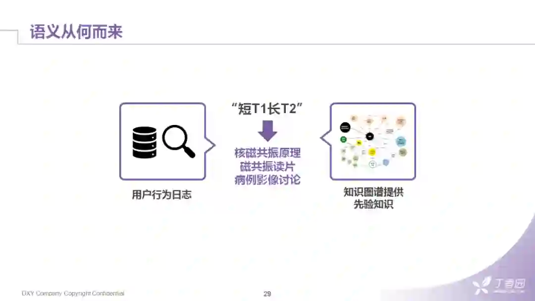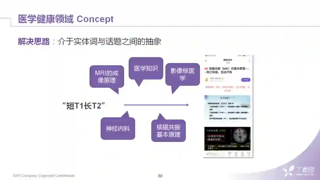 来看一个具体的query——"短T1长T2","短T1长T2"是什么意思呢?其实"T1"和"T2"分别代表着核磁共振中纵向与横向磁场变化的一个常量系数,两种磁场变化最终会影响骨骼与肌肉脏器在片子中的成像情况。这样的表述,通常会出现在病例影像讨论的帖子中,用户搜索的目的可能是想找类似的病例讨论,也可能是想学习一下核磁共振读片的方法。所以其语意从短短的几个字是无法从字面上获取的。所以,这些语义从何而来?可以很朴素的理解,信息始终只有两个来源:一个是人的先验知识,源自我们专业医学知识图谱的构建;第二是行为数据,对应的就是我们日常的业务日志以及文本上的挖掘。在理想的情况下,我们希望"短T1长T2"可以转换成,如:核磁共振的成像原理、影像、核医学、神经内科这样的主题,然后在这样的主题下再去关联到具体资讯的文章。