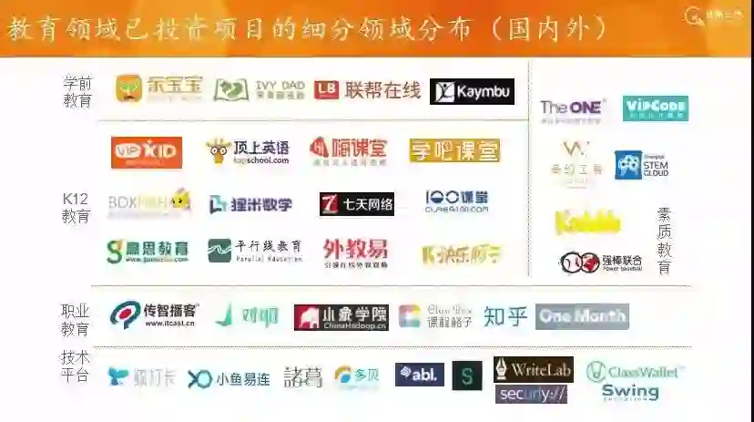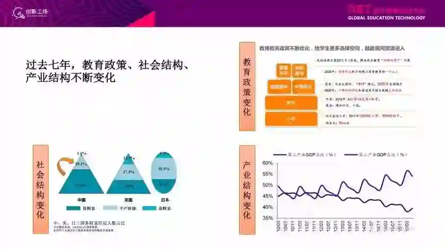 第三个方面,教育政策的变化。2017年9月1日,民促法修正案正式实施,这意味着所有的教育项目有了退出机制,以前是民非,不能上市。现在有了退出可能性,我们投资机构开始敢投高思、传智播客等项目。此外,还有三块变化也比较明显,一是学前政策不断变化,二是新高考、新中考政策相继出台,三是针对中学毕业后,政策开始重点扶持职业型教育。