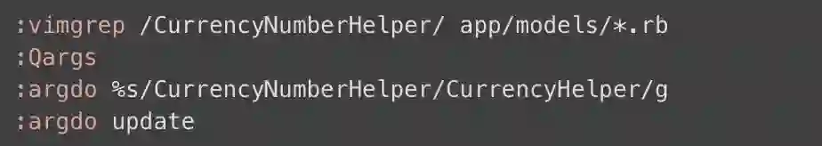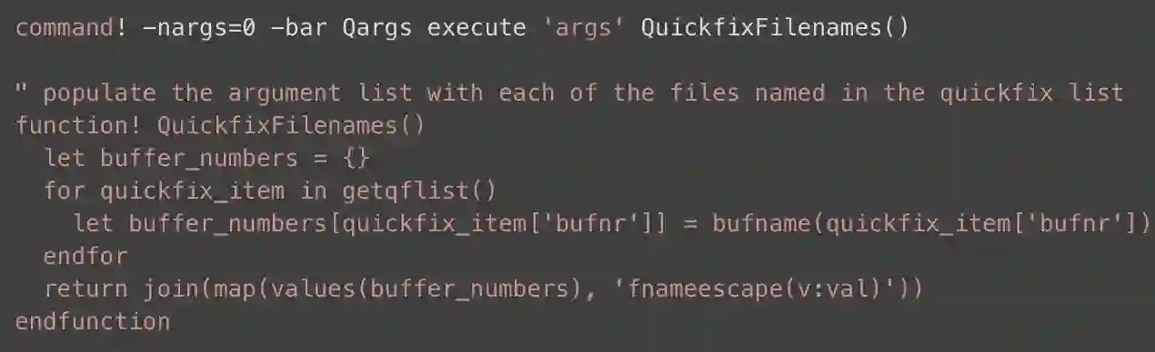 如果我们知道被操作的文件需要在哪里运行替换命令,那么上一个技巧可以正常工作。但是大多数时候,我们需要搜索文件中的文本,然后只在这些文件中运行替换命令。此时,我们可以通过使用 vimgrep 命令在文件查找匹配。vimgrep 命令可创建快速列表,其中包含与模式匹配的文件,该列表可通过 :copen 命令来打开查看。如果我们希望快速列表有用,需要使用 vimrc 文件中的 :Qargs 映射来将其转换为参数列表: