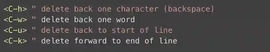 如果需要在插入模式、Vim 命令行模式或 Shell 命令行中删除字符、单词或行,有以下的快捷方式:
