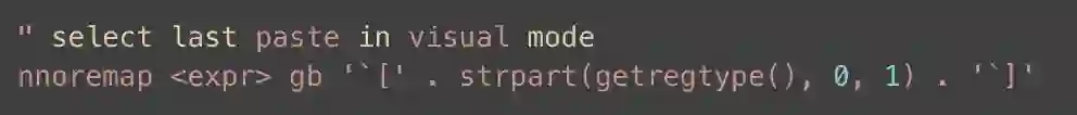 我们可以使用 gv 来选择原始的需要复制的文本,使用 gb 选择上一次粘贴的文本。gb 是一个自定义的映射,可将其添加到 vimrc 文件,而且该命令在进行提取方法重构、剪切时十分有用。我们还需要修复缩进,使用 gb 可以轻易选择粘贴的文本,然后使用 < 或 > 来进行修复。
