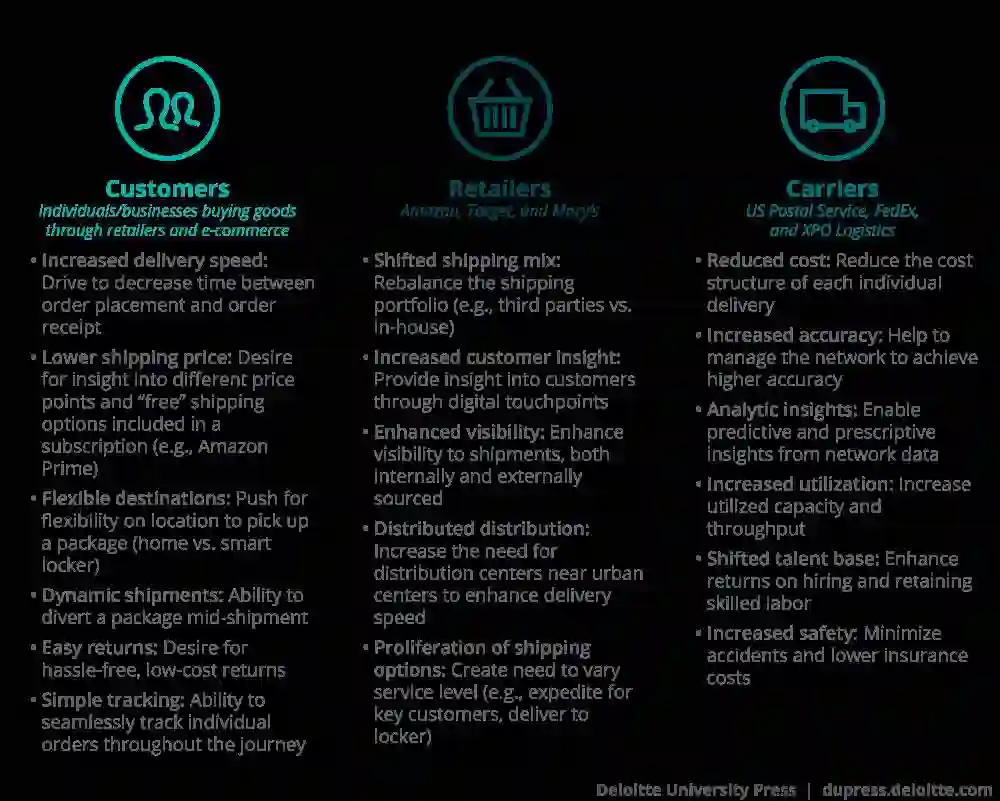这些新需求出现在业态持续转向电子商务的过程中。越来越多的互联网接入和更好的在线购物工具推动了出货量的增加,并为业内公司提供了更多的可选交货地点。例如,德勤假日调查( Holiday Survey)首次发现,2016 年间,客户的线上消费预算与线下商店一样多。 这在线上消费整体增长的背景下并不奇怪:据美国政府估计,电子商务销售额在 2015~2016 年上涨了近 15%。