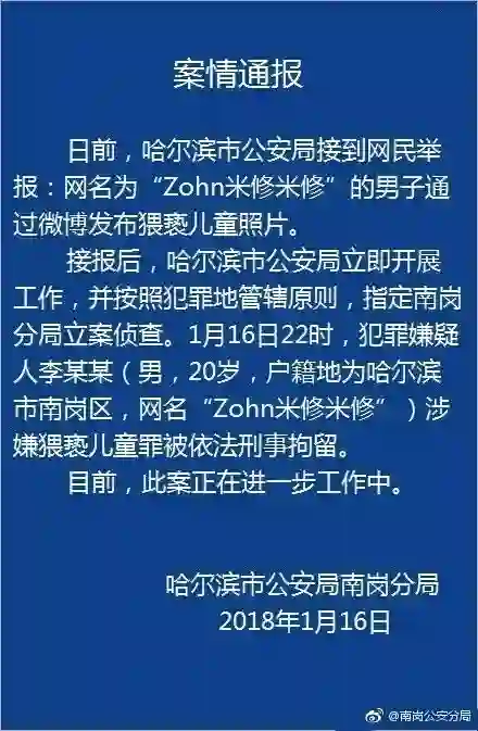 网警在接到网友举报后,第一时间展开调查,男子因涉嫌猥亵儿童已被公安机关刑事拘留,相关调查处理工作还在进一步进行中。