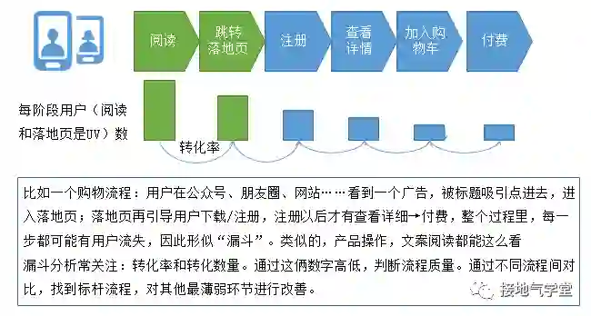 漏斗模型,常用来改善内容投放、新用户注册、产品流程。这些工作往往是若干环节组合,用户在操作过程中会因为环节太多而流失,类似漏斗的效果,所以有漏斗模型的说法。