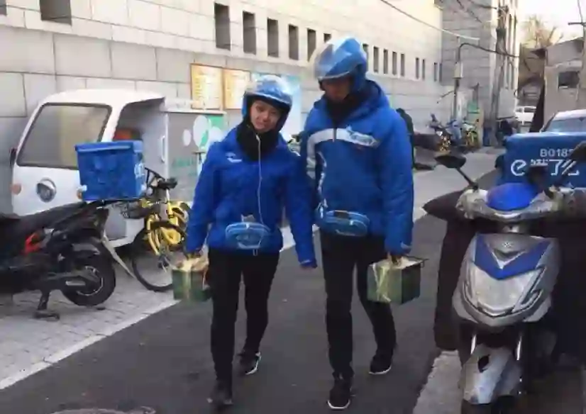 两个月后,刘秀梅也来到金融街配送站,站里多了这么一对夫妻外卖骑手。