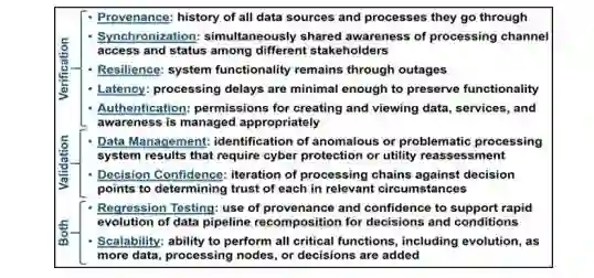 首先描述了数据、信息和知识的含义,并提供了我们对决策支持的定义。在描述一个系统的优势时,数据、信息和知识经常被交替使用,但每一个都代表了一个不同的背景和处理水平。数据是最低的形式,代表了几乎没有过滤的分析元素,如从传感器焦平面处理的信号检测。数据被用来推导信息,通过增加背景,如目标类型。知识是指在更广泛的态势感知或决策中意味着什么的信息,例如在一个场景中检测到的目标行为类型标志着危险。作为一个例子,已经有一些工作将 "数据整合 "推向了前进的方向,并展示了态势感知的操作能力。这些工作说明了从各种来源的数据,到通过各种软件应用的信息,再到呈现给操作者或用户的知识转换(图2)。通过应用处理层来创建一个增强的态势感知图,它使高级领导人能够更自信地采取行动和做出决定。这些处理层包括从简单的可视化数据摄取到分类服务以提供任务事件的背景。所有这些都为决策支持提供了不同程度的信息。图2:数据驱动的决策支持系统的一个例子。我们描述的系统的最终目标是为高层决策提供信息。这可能需要许多处理步骤,每一个步骤都代表着增加背景。这也意味着有许多细微的处理路径,通过这些路径可以得出知识。当你考虑到可能需要回应的时间框架时,当系统中存在更多的数据、算法和知识服务时,理解处理的细微差别就会变得成倍的困难。这就是我们试图减轻的风险。接下来,我们将介绍数据共享和互操作性环境,这些环境的建立是为了实现大规模系统的快速决策支持。这样一个环境有四个功能要求。(1)创新理念实施的低门槛,(2)大型开放的开发环境,(3)支持集成的消息传递方法,以及(4)对采用的组件进行自动验证和核实。图3显示了这四项要求的周期,并以蓝色强调了验证和确认要求,该要求目前正在系统范围内研究,是本文的重点。图3:系统进化所需的关键属性。虽然个别开发者可能被要求满足基本的期望,以诚信行事,例如遵守他们的数据和应用合约,以及使用软件安全扫描,但没有有效的方式来评估决策支持的效用和在整个系统中组装数据和服务的真实性。许多大规模的系统在开发初期没有优先考虑网络安全或数据完整性。传统上,在大型软件发布之前,在组件被大规模集成之后,会进行端到端的验证和确认测试。随后,对增量软件升级进行较小规模的回归测试。测试完成后,系统在技术上就可以投入运行了。然而,由于应用程序及其数据源的规模和动态性质,松散耦合的现代软件处理系统的性能风险会增加。在许多情况下,这些系统中的数据是由遥感测量源提供的。在这种情况下,对数据的完整性进行实时的系统级验证和对衍生的数据产品进行验证是非常重要的,以发现性能的潜在重大变化和呈现给操作员的错误信息。我们讨论的这种实时核查和验证方法需要记录数据来源、历史数据质量以及数据在系统中穿越的所有路径,以确保发现性能问题。在这种情况下,定义核查和验证的一般含义是很重要的。验证是对产品、服务或系统是否符合法规、要求、规范或强制条件的评价(PMI,2013)。换句话说,验证方法建立了真实性。验证是保证产品、服务或系统满足客户和其他确定的利益相关者的需求,包括适合性和信心(PMI,2013)。换句话说,验证方法建立了一些间接的可用性。如上定义,验证和确认提供了以下内容:图4提供了上述定义的验证和确认可衡量的子组件清单。我们建议使用区块链方法来实现这些指标的实时评估,这些指标已经在一个实时系统上得到了证明(MIT Lincoln Laboratory,2019)。图4:提议的系统验证和确认的指标。区块链方法通过提供一种有机的方法来解决验证问题,用于存储数据、处理出处和证明同步,同时提供系统的弹性和增加最小的延迟。图5显示了我们如何利用典型数据处理链的有向无环性质来覆盖加密安全并实现区块链。这种数据结构与传统的区块链应用是直接匹配的。在源层(S)和应用层(A)的每一步都有轻量级的加密安全,用户(U)可以验证正在呈现的数据。这种架构提供了以下方法:配置管理(每个软件更新都有一个独特的安全标签),错误取证(通过处理的每个路径都有一个独特的ID),并防止某些类型的恶意攻击(每个独特的ID都登记在一个用户可以使用的账本上)。图5:使用区块链叠加的系统验证。我们实现数据验证的方法涉及将数据特征分析添加到区块链基础设施中,并与处理链相耦合。预编译的数据特征统计和人工智能技术可以被纳入,以提供验证指标(例如,校准的性能分布)。这些指标将被实时计算,并与预编译的特征进行比较以进行验证。图6说明了这个概念。图6:使用机器学习方法进行系统验证