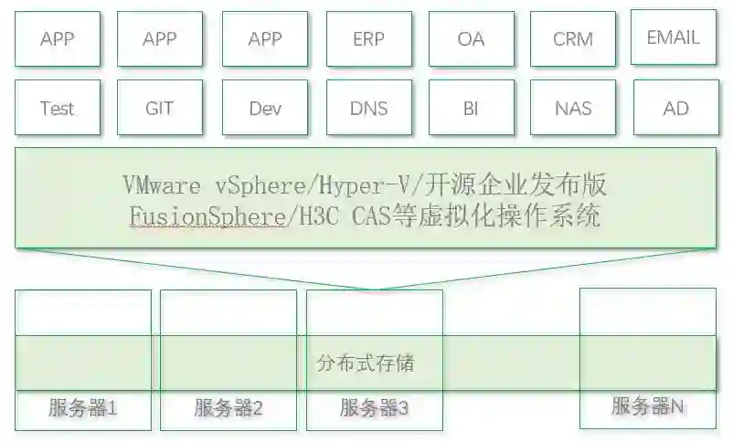这种方案是目前最主流的云化数据中心方案,主要采用的方案就是虚拟化操作系统、服务器与企业级集中式存储,该方案成熟度最高。这种方案,随着虚拟机规模增加,底层的集中存储会越来越感觉到不够用。这时候需要增加新的存储或服务器部署,重新迁移或分布虚拟机系统。